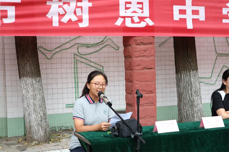 1班孔智琳同学发言:我们踏着九月的金色阳光,迈入了树恩中学的大门,心中有说不尽的自豪与喜悦