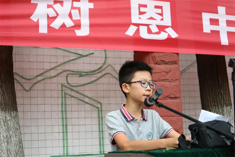 1班唐皓文同学发言:让我们追求卓越,创造出属于自己的峥嵘岁月,树恩中学会因你的奋斗而更加精彩